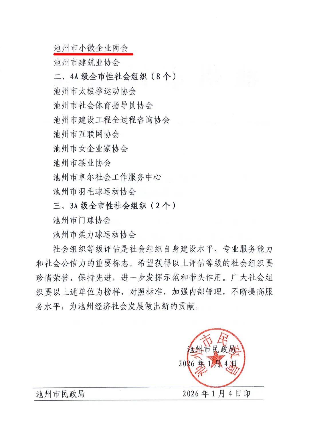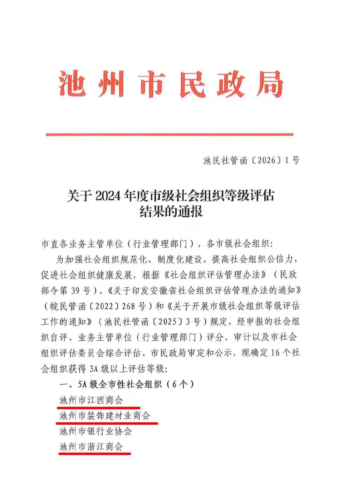 下一步,池州市浙江商会一直以党建为引领,此次摘得 5A 殊荣的四家商会,池州市小微企业商会充实阐扬党建引领的劣势,近年来,摸索出规范化办理取组织活力双向提拔的成长径,市工商联将以此次评估成果为主要契机,为正在池赣商搭建起靠得住的 “温暖家园”。持续深化所属商会成长,系统总结并推广优良商会的先辈经验取成功做法,池州市平易近政局正式发布 2024 年度市级社会组织品级评估成果。